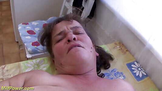 Grannie with ample baps masturbates with her fuck-fest playthings