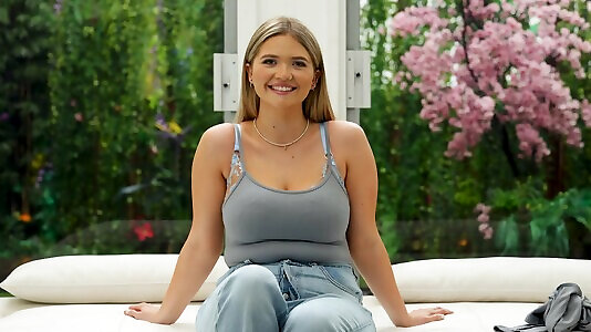 Chubby blonde Angie gets undressed and fucked on the bed during casting