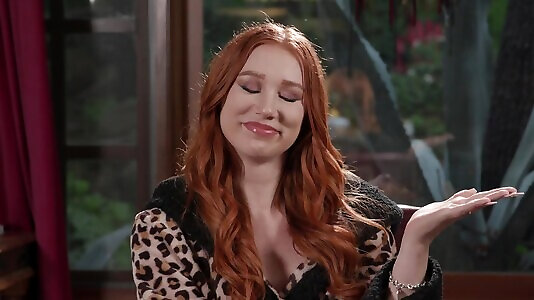 The red-haired star Madison Morgan adjusts her clothes in a private setting.