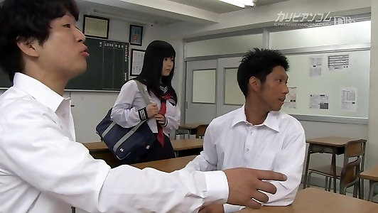 Two trampy school gals Mai Konishi and Nene Mukai are boning in a group orgy vid