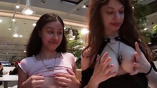 Aroused Asian sweethearts showcasing undies in public