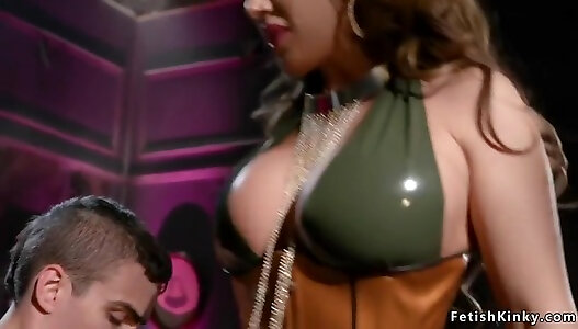 Huge-chested bondage & discipline gimp gags on maledoms dick in three
